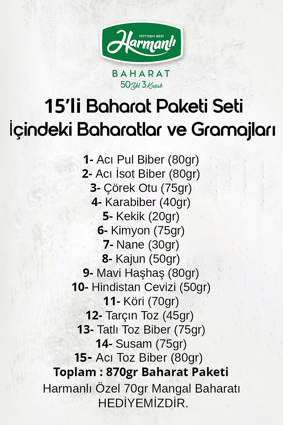 © 1971-2025 Harmanlı Baharat Tüm Hakları Saklıdır.